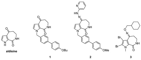 Marine sponges are an important source of potential natural bioactive ingredients that have formed natural secondary metabolites with complex and unique structures to adapt to the harsh marine survival conditions [12,13]. Aldisine (Figure 1) and its derivatives are the secondary metabolites from sponges with unique pyrrolo [2,3-c] azepine skeleton structural features that exhibit antitumor activity by inhibiting protein kinase [14,15]. It was reported that the oximes, oxime ethers, and hydrazones groups in aldisine can provide numerous hydrogen bond donor and acceptor moieties, which showed antiviral, larvicidal, and anti-phytopathogenic-fungus activities [16]. Modified aldisine at N-1 and C-4 positions obtained compounds 1 to 3 (Figure 1), which could enhance its antiproliferative activity [17,18,19,20]. The extensive antiproliferative properties of aldisine have made it a significant drug for cancer therapy. Due to its promising biological activities and multi-site modification, aldisine has become a focus of pharmaceutical chemistry as a lead compound, especially in antitumor aspects.
