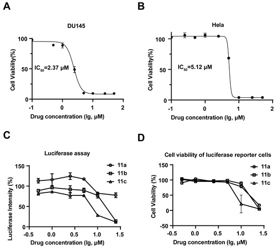 Next, for further understanding of the structure-activity relationship between aldisine derivatives, the inhibitory activities of 11a, 11b, and 11c were tested. The results showed that compounds 11a, 11b, and 11c exhibited significant antiproliferative activity against four human cancer cell lines: prostate cancer (DU145), non-small cell lung cancer (A549), breast cancer (MDA-MB-231), and cervical cancer (HeLa) (Table 1), with 11c being the most potent. Compound 11c inhibited the growth of DU145 cells with an IC50 value of 2.37 μM (Figure 2A) and HeLa cells with an IC50 value of 5.12 μM (Figure 2B). STAT3 can be activated in cancer cells in a constitutive or IL-6-induced manner [25,26]. In both DU145 and A549 cells, STAT3 is constitutively activated, whereas in Hela and MDA-MB231 cells, IL-6 can induce significant STAT3 activation [27,28,29]. Therefore, we next evaluated whether aldisine derivatives can inhibit STAT3 signaling. A STAT3 transcriptional activity-based high-throughput luciferase reporter was applied [23]. Interestingly, STAT3 luciferase inhibitory activities as well as the antiproliferative effects were indeed observed for 11a, 11b, and 11c (Figure S1; Figure 2C,D). The IC50 value of 11a, 11b, and 11c was generally lower and exhibited greater inhibitory activity as the length of alkyl carbon groups increased. Compound 11c with two six-carbon chain lengths showed the highest activity, which inhibited cancer cell growth in a dose-dependent manner and could be a potential JAK/STAT3 pathway inhibitor at a relatively low concentration.