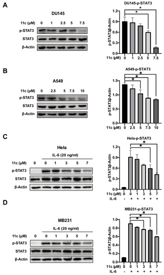 To further determine whether 11c can inhibit the activation of STAT3, we first treated DU145 and A549 cells with 11c at the indicated concentrations for 2 h and then analyzed the phosphorylation of STAT3 by Western blot (Figure 3A,B). Compound 11c inhibited constitutively activated STAT3 at the concentration of 5 μM both in DU145 and A549 cell lines. In consideration of IL-6 as the major cytokine participant in STAT3 activation and its significance in cancer formation and suppressing the antitumor immune response [4,30], we further examined the effect of 11c on IL-6-induced STAT3 activation cell lines such as Hela and MB231 cells (Figure 3C,D). The results indicated that 11c inhibited non-constitutive STAT3 activation at the concentration of 7 μM in a dose-dependent manner. Taken together, the Western blot analysis results suggested that 11c treatment inhibits the constitutive and IL-6-induced STAT3 phosphorylation in cancer cells.