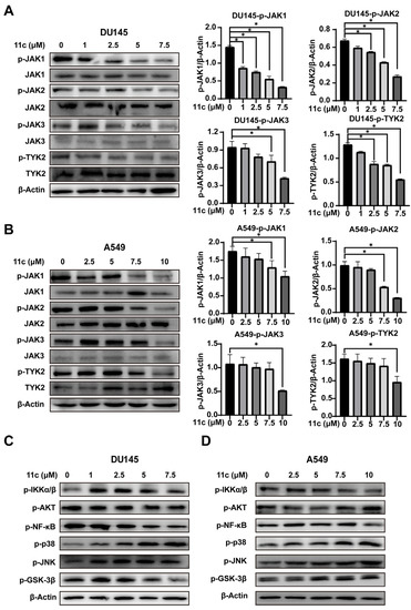 11c was indicated as a pan-JAK inhibitor. Constitutive STAT3 activation cells DU145 and A549 were treated with 11c at the indicated concentration for 1 h and then total protein was analyzed by Western blot. (A,B) Phosphorylation and total expression of four JAK members were detected. (C,D) Phosphorylation of IKKα/β, AKT, NF-κB, p38, JNK, and GSK-3β were detected. The relative expressions compared to the loading control protein β-Actin were measured by ImageJ from 3 individual experiments and shown as bar graphs on the right side of each Western blot. Error bars indicate means ± SD. p < 0.05 (*), significant, Student’s t-test, one-way ANOVA.
