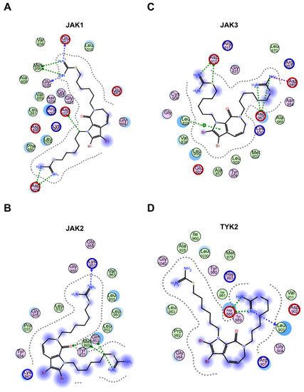 JAKs, with a total length of 120–140 kD, are essential for many biological outcomes of cytokine signaling. The JAK family contains four members (JAK1, JAK2, JAK3, and TYK2), with the end being a catalytic or kinase domain at the carboxyl end, and the front is a pseudokinase (PK) or kinase-like domain. JAK binds to the Box1 and Box2 domains of cytokine receptors through the amino-terminal ezrin-radixin- moesin (FERM) domain and Src Homology 2 (SH2) domain [32,33,34]. Molecular docking software provides a good platform for the interaction between molecules (ligands) and target proteins (receptors) [32]. In our research, molecular docking was conducted to examine the interaction between compound 11c and JAK1 (PDB number: 4EHZ), JAK2 (PDB number: 7Q7W), JAK3 (PDB number: 4Z16), and TYK2 (PDB number: 4GJ2). The data indicated that the hydrophobic fatty chain was surrounded by a hydrophobic pocket. In addition, the isothiouronium and hydrogen interact with amino acid residues through hydrogen bonding, forming six hydrogen bonds with Glu-957, Met-956, Gly-1020, and Asp-1039 in JAK1 (Figure 5A). Similarly, in JAK2, it forms four hydrogen bonds with Lys-857, Met-865, and Gln-853 residues (Figure 5B), while in TYK2, it forms two hydrogen bonds with Asp-988 and Tyr-989 (Figure 5D). Specifically, in JAK3, in addition to four hydrogen bonds with Asp-912 and Asp-967, a π–π interaction is also formed with the indole ring of compound 11c (Figure 5C). Overall, molecular docking revealed that the hydrogen bond is the main interaction between 11c and JAK members; furthermore, the interaction intensity differences in the four JAK members were related to the inhibition effect of 11c.
