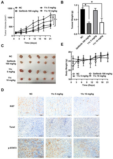 11c inhibits the growth of DU145 cells in vivo. Nude mice with DU145 xenograft tumors were treated with vehicle, Gefitinib (100 mg/kg, p.o., q.2d.) or 11c (5 or 10 mg/kg, i.p., q.2d.) for 21 days. On the last day, nude mice were sacrificed. (A) The tumor volumes before excision were calculated every three days. (B) The tumor weights were measured on the day before the nude mice sacrifice. (C) Tumors were excised and photographed. (D) Immunohistochemical (IHC) analysis of tumor slices by Ki67, Tunel, and p-STAT3 staining. (E) The body weights were recorded every three days. Error bars indicate means ± SEM. p < 0.05 (*), significant, Student’s t-test, two-way ANOVA.