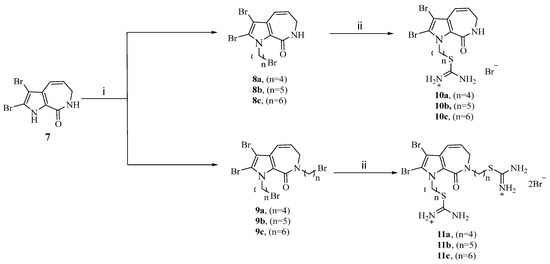 Considering the rotatability of different lengths of carboxyalkyl chains (n = 4,5,6) and the positive charge of the isothiouronium group, which can easily approach the cell membrane, we first designed and synthesized isothiouronium-modified aldisine derivatives at N1 positions in two steps as outlined in Scheme 1. Compound 7 was prepared from the 2-(trichloroacetyl) pyrrole according to the synthesis procedure of marine natural products Stevensine [24]. Subsequently, compound 7 reacts with excessive dibromoalkanes (n = 4,5,6) in DMSO for 1.5 h under the basic condition of KOH to obtain bromoalkyl derivatives 8a, 8b, 8c, 9a, 9b, and 9c, which were separated by silica gel chromatography with a 39~56% yield. Then 8a, 8b, 8c, 9a, 9b, and 9c were reacted with thiourea reflux for 12 h in ethanol to produce the target compounds 10a, 10b, 10c, 11a, 11b, and 11c with a yield of 57~67%.