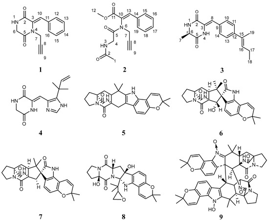 In order to fully explore the alkaloids of ST0501, molecular networking analysis was performed on the crude ethyl acetate extract (EtOAc) of solid rice and wheat cultures of A. sclerotiorum ST0501. The results show that there are signals associated with alkaloids. The relationship between compound 2 and compound 6 is close. Based on the indication of molecular networking (Figure 1), three unreported (1–3) and six previously described alkaloids (4–9) (Figure 2) were isolated by using a combination of column chromatography including silica gel, octadecylsilyl, Sephadex LH-20 columns and semi-preparative HPLC. The structures of gartryprostatin C (4) [19], stephacidin A (5) [20], sclerotiamide (6) [21], notoamide B (7) [22], speramide C (8) [18] and stephacidin B (9) [23] were elucidated by comparison of their spectroscopic data with those previously reported in the literature.