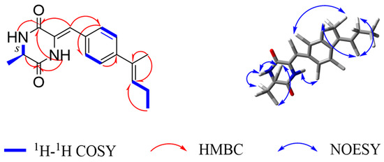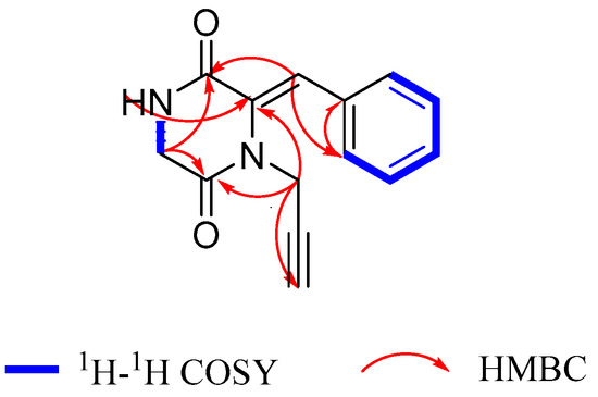 Sclerotioloid A (1) was isolated as a yellow powder. Its molecular formula C14H12N2O2 was deduced from its HRESIMS m/z 263.0794 [M+Na]+ (calcd for C14H12N2O2Na, 263.0797) and 1D NMR data analysis, suggesting ten degrees of unsaturation. The IR spectrum of 1 featured typical absorption bands for alkyne (2361 cm−1) and conjugated ketone (1698 cm−1). The 1H NMR spectrum of 1 (Table 1) exhibited one amine proton (δH 8.42, s, 1-NH), five aromatic protons (δH 7.35–7.40, m, 1-substituted benzene ring), one olefinic proton (δH 7.10, s, H-10), two methylene protons (δH 4.13 d, J = 2.4 Hz, H-7; δH 4.01 d, J = 2.3 Hz, H-6) and one acetylenic proton (δH 3.10, t, J = 2.4 Hz, H-9). The 13C NMR spectrum, in combination with HSQC spectra, revealed the presence of fourteen carbons, including two amide carbonyl (δC 165.7, C-5 and δC 163.4, C-2), six aromatic carbons (δC 133.4, C-11; δC 129.4, C-13 and C-15; δC 128.8, C-14; δC 128.6, C-12 and C-16), two olefinic carbons (δC 129.9, C-3 and δC 120.8, C-10), two alkynyl carbons (δC 78.2, C-8 and δC 74.5, C-9) and two methylene sp3 (δC 44.5, C-6 and δC 32.9, C-7). The correlations between H-1 and H-6 in the 1H-1H COSY spectrum and the HMBC correlations between NH-1 and C-3 and between H-6 and C-2/C-5 revealed the existence of a 2,5-diketopiperazine ring. Furthermore, the HMBC correlations between H-10 and C-2/C-3/C-16 indicated that the benzene ring was connected to C-3 of the 2,5-diketopiperazine ring through C-10. Based on the HMBC correlations between H-7 and C-3/C-5/C-9, the alkynyl group was connected to N-4 of the 2,5-diketopiperazine ring (Figure 3). According to the (Z)-vinyl proton chemical shifts of H-7 (δH 7.03) in nocazine C [24] and H-7 (δH 6.54) in (3S,6E)-3-benzyl-6-benzylidenepiperazine-2,5-dione [25], the Δ3,10 double bond in 1 was deduced to have a Z configuration due to the relative downfield shift of H-10 (δH 7.10), where the (Z)-vinyl proton had a larger downfield shift than that of the (E)-vinyl proton because of the deshielding effect of the carbonyl in 2,5-diketopiperazine [24,25,26,27]. Therefore, the structure of 1 was elucidated.
