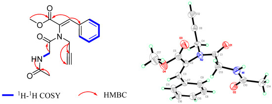 Sclerotioloid B (2) was also isolated as a yellow powder. The HRESIMS spectrum of 2 indicates a molecular formula of C17H18N2O4 based on the prominent peak [M+Na]+ at m/z 337.1160 (calcd for C17H18N2O4Na, 337.1164), as well as 1D NMR data analysis, requiring ten degrees of unsaturation. The IR spectrum of 2 featured typical absorption bands for alkyne (2361 cm−1) and conjugated ketone (1557 cm−1). The 1H NMR and 13C NMR spectroscopic data of 2 (Table 2) showed high similarity with 1, except for the appearance of one methoxyl protons resonating at δH 3.81 (H-12) and one methyl protons resonating at δH 1.77 (H-1), as well as the additional carbonyl carbon resonating at δC 169.0 (C-2). The existence of an acetamide group was suggested by the HMBC correlations between NH-3 and C-2, between H-1 and C-2 and between H-4 and C-5, as well as the COSY correlation between NH-3 and H-4. The additional HMBC correlations between H-12 and C-11 and between H-13 and C-11/C-15 proved that the benzene ring is connected to the methyl acrylate portion at C-13 (Figure 4). Finally, a single crystal of 2 was obtained after one week of slow crystallization in 95% MeOH (H2O) at 4 °C by optimizing the conditions. Therefore, the structure of 2 was confirmed by X-ray crystal diffraction analysis, and this further proved the Z configuration of the Δ10,13 double bond.
