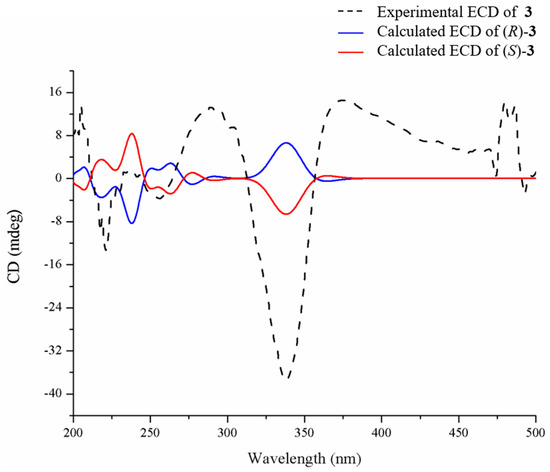 Sclerotioloid C (3) was isolated as a white powder. Its molecular formula, C17H20N2O2, is based on its HRESIMS m/z 323.1370 [M+K]+ (calcd for C17H20N2O2K, 323.1162) and 1D NMR data analysis, suggesting nine degrees of unsaturation. The IR spectrum of 3 featured typical absorption bands for olefin (2923 cm−1) and conjugated ketone (1512 cm−1). The 1H NMR spectra of 3 (Table 3) displayed two amine protons (δH 9.79, s, 4-NH; 8.35-8.37, m, 1-NH), four aromatic protons (δH 7.44, d, J = 8.8 Hz, H-10 and H-14; δH 6.95, d, J = 8.8 Hz, H-11 and H-13), two olefinic protons (δH 6.64, s, H-8; δH 5.43, tt, J = 6.7, 1.4 Hz, H-16), one methylene (δH 4.55, d, J = 6.7 Hz, H-17), one methine (δH 4.11, d, J = 6.8 Hz, H-6), and the protons of three methyl groups (δH 1.74, s, H-19; δH 1.71, d, J = 1.3 Hz, H-18; δH 1.33, d, J = 7.0 Hz, H-7). 13C NMR and HSQC data revealed the presence of seventeen carbons, including two amide carbonyl (δC 167.6, C-2 and δC 160.7, C-5), ten sp2 resonated between δC 158.2 and δC 114.3, one methylene sp3 (δC 64.3, C-17), one methine sp3 (δC 50.3, C-6) and three methyl (δC 25.4, C-19; δC 19.2, C-7; δC 18.0, C-18) carbons. The COSY correlations between NH-1 and H-6 and between H-6 and H-7 and the HMBC correlations between NH-4 and C-2/C-5/C-6, between H-6 and C-2/C-5/C-7 and between H-7 and C-2/C-6 revealed the existence of the 2,5-diketopiperazine ring. The COSY correlations between H-6 and H-7 and the HMBC correlations between H-7 and C-6 revealed that the methyl group is connected to C-6 of the 2,5-diketopiperazine ring. The COSY correlations between H-13 and H-14 and the HMBC correlations between H-12 and C-13/C-14 and between H-14 and C-10 revealed the existence of 1,4-disubstituted benzene ring. The HMBC correlations between H-8 and C-2/C-10 and between H-10 and C-3 indicate that the 2,5-diketopiperazine ring is connected to C-9 of the benzene ring through C-8. The COSY correlations between H-16 and H-17 and between H-and to H-18 and the HMBC correlations between H-17 and C-12/C-16, between H-18 and C-15/C-16 and between H-19 and C-15/C-16, indicate that the cis-2-pentene is connected to C-12 of the benzene ring (Figure 5). Therefore, the planar structure of 3 was elucidated as a new diketopiperazine derivative. The configuration of the double bond in 3 was established by the analysis of its NOESY spectrum (Figure 5). The NOESY spectrum did not show any correlation between H-16 and H-19, confirming the E configuration of the double bond between C-15 and C-16. In addition, there was no NOESY correlation between H-8 and 4-NH, suggesting Z configuration of the double bond between C-3 and C-8. The absolute configuration of C-6 in 3 was determined by the TDDFT-ECD approach. The experimental ECD spectrum of 3 matched well with the calculated ECD spectrum of S-3 (Figure 6) and further supported its absolute configuration.