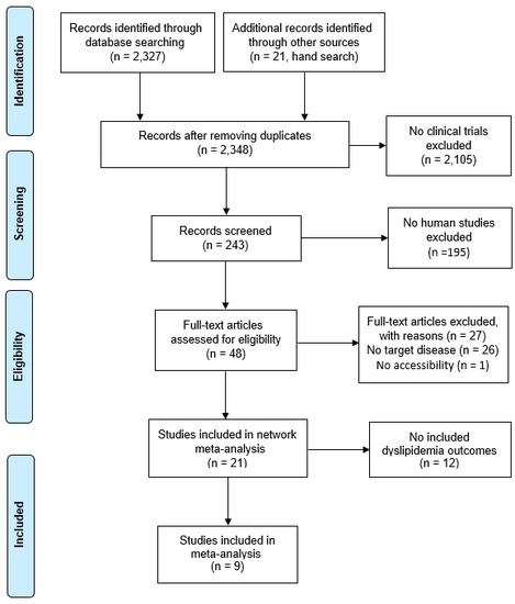 A total of 2327 study reports were searched: 17 in PubMed, 2305 in Embase, and 5 in Cochrane. Subsequently, 21 studies were included and additional records were identified through manual search. Among them, 195 nonhuman studies were excluded, leaving 2105 papers that were not included as clinical trials. In addition, 26 papers without the target diseases and 1 unavailable paper were excluded. Nine studies were chosen after eliminating twelve studies that did not include indicators of dyslipidemia (Figure 1).