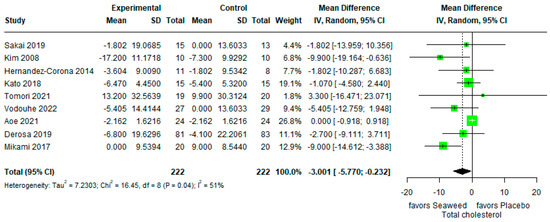 The effects of brown seaweed on total cholesterol in this meta-analysis are shown in Figure 2. A statistically significant decrease in total cholesterol levels between the control and experimental groups was observed (mean difference, −3.001 [95% CI, −5.770, −0.232]). This suggests that brown seaweed significantly reduces total cholesterol levels in participants with T2DM (Sakai [30], Kim [13], Derosa [31]), participants with obesity (Corona [33]), participants with obesity/pre-diabetes (Vodouhè [32]), and participants with normal weight/obesity (Mikami [34]). Heterogeneity of the pooled estimates was high (I2 = 51%).
