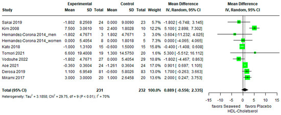 Our findings demonstrated that with brown seaweed intake, HDL cholesterol levels increased, but the impact was not statistically significant in both the control and experimental groups (mean difference: 0.889; 95% CI: −0.558, 2.335). Kim et al. (2008) demonstrated that people with type 2 diabetes taking powdered sea tangles and sea mustard pills showed increased HDL cholesterol levels (p < 0.05) [13]. An animal study conducted in 2012 indicated that dietary fucoxanthin (0.2%) increases HDL cholesterol levels and decreases hepatic cholesterol levels in obese and diabetic mice [39]. Fucoxanthin is the most prevalent carotenoid in brown seaweed and has antioxidant properties [18,40]. A previous review indicated that the induction of sterol regulatory element-binding proteins is associated with the promotion of HDL cholesterol by fucoxanthin in brown seaweeds [41]. Fucoidan from Laminaria japonica elevates HDL cholesterol levels in hyperlipidemic rats (p < 0.05 ) [42]. Fucoidan ingestion increased HDL cholesterol levels by blocking the expression of fat synthetase genes in HepG2 hepatocytes and liver tissues [43].