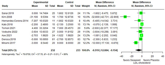 The effects of brown seaweed on LDL cholesterol levels are shown in Figure 4. The differences between the control and experimental groups were statistically significant. The LDL cholesterol level in the experimental group was lower than that in the control group (mean difference, −6.519 [95% CI −12.884, −0.154]). This suggests that brown seaweed has been associated with decreased LDL cholesterol levels in participants with T2DM (Sakai [30], Kim [13], Derosa [31]), obesity/pre-diabetic (Vodouhè [32]), normal-weight/obesity (Mikami [34]), obesity (Corona [33]), and healthy participants (Kato [27], Tomori [28], Aoe [29]). Heterogeneity of the pooled estimates was high (I2 = 86%).