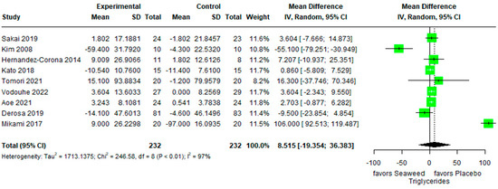 The effects of brown seaweed on triglycerides are shown in Figure 5. No significant difference between the experimental and control groups was observed (mean difference 8.515 [95% CI −19.354, 36.383]). Heterogeneity of the pooled estimates was high (I2 = 97%).