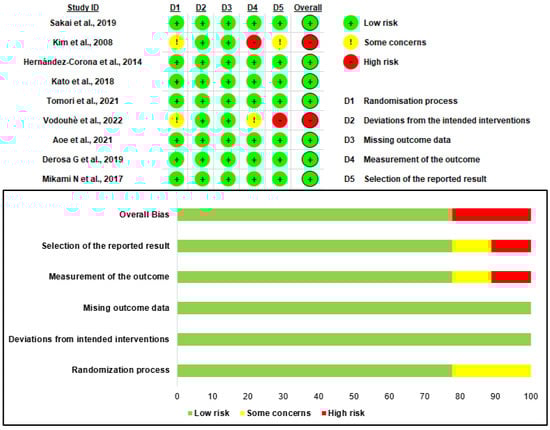 Figure 6 depicts the risk of bias in the nine selected studies. As all studies were randomized controlled trials, the quality of the studies was evaluated using RoB 2.0. In the randomization process section, seven studies were classified as low risk, in the deviations from the intended intervention section, all studies were classified as low risk, and all studies were designated as low risk in the component of the study that lacked outcome data. In the outcomes section, seven low-risk, one of some concern, and one high-risk patients were identified. In the section on reported result selection, one high risk, one of some concern, and seven low risks were identified. Based on the algorithm, the overall evaluation indicated seven low risk and two high risk cases.
