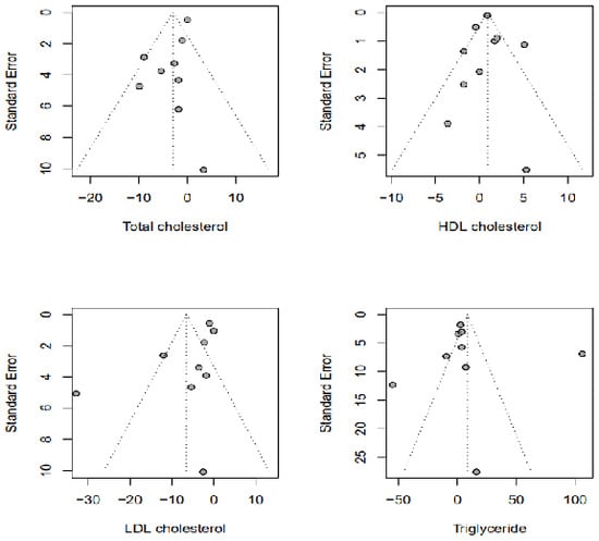 Table 3 outlines the results of subgroup and meta-regression analyses. In the meta-regression analysis, subgroup analyses by duration (greater and less than 3 months), race (Asian, Hispanic, and Caucasian), and female participation rate did not reveal statistically significant differences in the reduction in risk factors for dyslipidemia. Although not statistically significant, a higher female participation rate showed a decreasing tendency in total cholesterol (SMD: −13.141, 95% CI −42.559, 16.316) and LDL cholesterol levels (SMD: −14.172, 95% CI −70.258, 41.914).