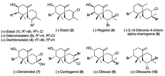 A collection of ten known chamigrane-type sesquiterpenes (1–10) (Figure 1) with structural variety in the level of saturation, halogenation and oxygenation were isolated from the organic extracts of specimens of the Laurencia dendroidea collected in distinct areas of the southeastern Brazilian coast: (+)-elatol (1); (−)-elatol (2); (+)-debromoelatol (3); (+)-dechloroelatol (4); (−)-rogiolol (5); (−)-3,10-dibromo-4-chloro-alpha-chamigrane (6); (−)-dendroidiol (7); (−)-cartilagenol (8); (+)-obtusol (9); and (+)-obtusane (10) [32,33].