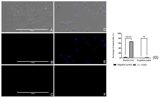 Naegleria fowleri trophozoites incubated with IC90 of (+)-elatol (1) for 24 h (D–F), negative control (A–C). Condensed chromatin can be seen in treated cells (E) since the Hoechst stain emits an intense fluorescence while no blue stained cells can be observed in the negative control cells (B). The iodide channel (C,F) shows no red fluorescence in the cells incubated with the yucatecone (F) nor in the non-treated cells (C), meaning that the PI stain was not permeable to the cells. Images (×40) are representative of the observed cell population and were obtained in the EVOS M500 Cell Imaging System, Life Technologies, Spain. Scale bar: 100 µm. (G) The bar graph represents the mean percentage of the stained cells and the standard deviation (SD) after the performance of three different assays. Differences between the values were assessed using a one-way analysis of variance (ANOVA); **** p < 0.0001; ns = no significant. The measurement was performed in the EVOS™ M5000 Software (Invitrogen by Thermo Fisher Scientific). Five different images were evaluated each time.