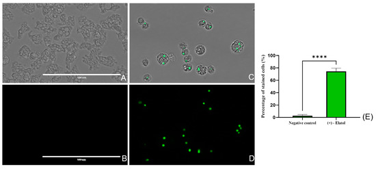 Evaluation of plasma membrane integrity of Naegleria fowleri (ATCC 30808™) trophozoites after the treatment with (+)-elatol (1) for 24 h. For this assay, the SYTOX® green dye was used. The stain is impermeable to healthy (untreated) cells in which fluorescence is not observed (A,B). However, the plasma membrane is damaged in treated cells, allowing the SYTOX® green to travel through it and bind to the DNA emitting an intense green fluorescence (C,D). Overlay channel (A,C) and GFP channel (B,D). Images (×40) were obtained using an EVOS M5000 Cell Imaging System, Life Technologies and are representative of the cell population. Scale bar: 100 µm. (E) The mean percentage of stained cells and the SD are represented in the graph. Moreover, the difference between the stained cells of the treated and non-treated cells was evaluated employing a one-way analysis of variance (ANOVA); **** p < 0.0001 significance. The experiment was carried out three times and each time five different images were analyzed in the EVOS m5000 Cell Imaging System, Life Technologies.