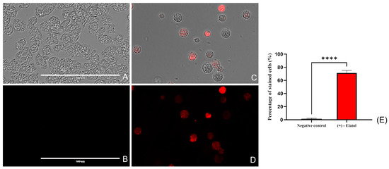 Trophozoites treated with the IC90 of (+)-elatol during 24h (C,D) show an intense red fluorescence due to the increase of the intracellular ROS generation. Cells incubated with bactocasitone (negative control) (A,B). Cells were exposed to CellROX® Deep Red (5 μM, 30 min) at 37 °C in the dark. (E) The bar graph includes the mean value and the SD of the stained cells after performing the experiment in triplicate. Scale bar: 100 µm. The analysis of variance was performed in the GraphPad.PRISM® 9.0 software and was determined by a one-way analysis of variance (ANOVA); **** p < 0.0001 significant differences when comparing treated cells to negative control. The number of stained cells was determined in the EVOS™ M5000 Software (Invitrogen by Thermo Fisher Scientific) processing five different images (×40) each time.