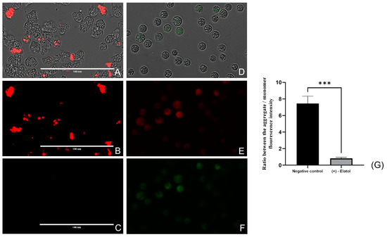 Evaluation of the mitochondrial membrane depolarization with the JC-1 stain (Cayman Chemical). Trophozoites treated with the IC90 of (+)-elatol (1) (D–F) and non-treated cells (A–C). The JC-1 dye emits red fluorescence in healthy conditions (negative control) (A,B) while the green fluorescence cannot be observed (C). However, the treatment of the cells with (+)-elatol (1) induces the depolarization of the mitochondrial membrane potential, showing a decrease in the intensity of the red fluorescence (as there are less J-aggregates) (E) and increasing the green fluorescence (a bigger amount of JC-1 monomers) (F). Images (×40) are representative of the cell population observed in the EVOS M5000 Cell Imaging System, Life Technologies, Spain. Scale bar: 100 µm. (G) Bar graph includes the ratio between the mean fluorescence emitted by the aggregate form of the JC-1 dye (red) and mean fluorescence emitted by the monomer form (green) of both treated and non-treated cells. Differences between the values were assessed using a one-way analysis of variance (ANOVA). Data are presented as means ± SD (N = 3); *** p < 0.001; significance differences when comparing treated cells to negative control. Mean fluorescence intensity values were calculated with the EVOS™ M5000 Software (Invitrogen by Thermo Fisher Scientific) tools. The experiments were conducted in triplicate and each time five different images were processed.