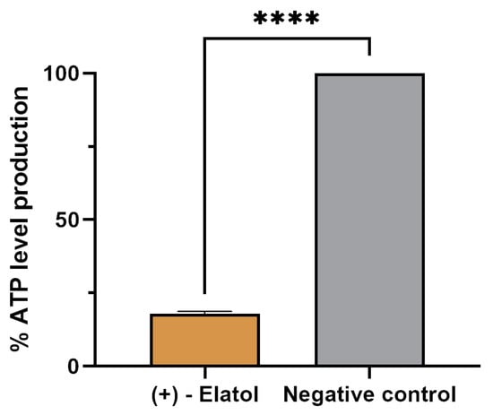 Effect of (+)-elatol (1) on ATP production. The results represent the percentage of ATP levels production relative to the negative control (untreated cells). Data represent the mean and the SD of three different assays. The ATP production is reduced in 82.11% in treated amoebae in comparison with the negative control. A one-way analysis of variance (ANOVA) in the GraphPad.PRISM® 9.0 software was performed in order to analyze the difference between values; **** p < 0.0001 significant differences when comparing treated cells to negative control.