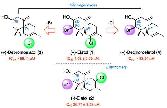 An interesting aspect in this study from the structural and biological perspective is the fact that a comparison with the enantiomer of the most active molecule was possible. Thus, (−)-elatol (2) was shown to be 34-fold less potent with an IC50 of 36.77 μM and 38.03 μM, than (+)-elatol (1) (Figure 7). Additionally, the loss of any halogen atoms, such as bromine at C-10 or chlorine at C-2, leads to a significant decrease of activity ((+)-debromoelatol (3), IC50 > 98.11 μM and (+)-dechloroelatol (3), IC50 > 83.54 μM).