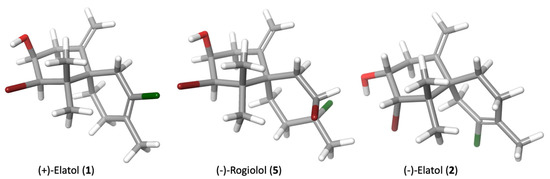 The compounds 1 and 2 were identified as the enantiomers (+)-elatol (1) and (−)-elatol (2). These metabolites showed identical NMR and mass spectrometry (MS) experimental data (see Supplementary Material). However, they exhibit opposite optical rotations and equal magnitude: +80 (c 0.20, CHCl3) and −80 (c 0.20, CHCl3) for compounds 1 and 2, respectively. These data confirm that it is the enantiomers dextrorotatory or (+) and levorotatory or (–) of elatol (2).