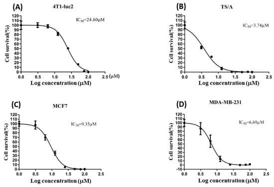 The IC50 values of cell viability in 4T1-luc2, TS/A, MCF7, and MDA-MB-231 cells.
