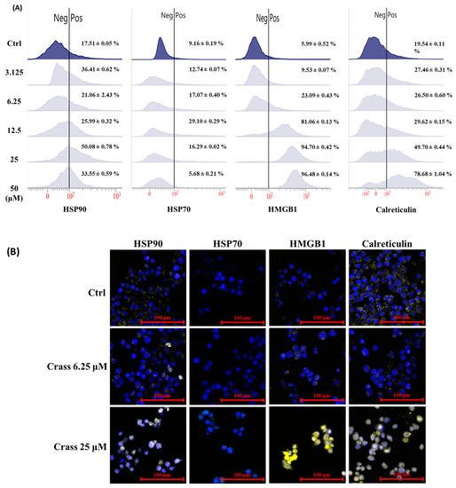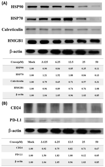 The 4T1-luc2 tumor cells were treated with crassolide (50 to 3.125 µM) for 24 h. Aliquots of 1 × 106 4T1-luc2 tumor cells were harvested, washed with PBS, and stained with PE anti-HSP90 antibody (LSBio, LS-63265), Alexa Fluor 488 anti-Hsp70 antibody (BioLegend, #648004), PE anti-HMGB1 antibody (BioLegend, #651404), PE anti-calreticulin (Cell signaling, #62304), APC anti-PD-L1 (BioLegend, #124312), Alexa Fluor 488 anti-CD24 (BioLegend, #101816) in 0.5% bovine serum albumin (BSA, Bionovas) in PBS, and then analyzed using flow cytometry (BD FACSVerse, San Jose, CA, USA).