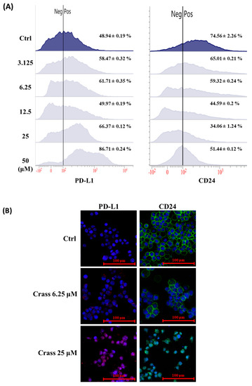Our data showed that crassolide significantly induced immunogenic cell death (ICD) in 4T1-luc2 cells. We further examined the effect of crassolide on the regulation of “don’t eat me signals” in these cells. The cells were treated with various concentrations of crassolide for 24 h, and we used flow cytometry analysis to measure the expression of PD-L1 and CD24 on the cell surface. Figure 4A illustrates that the control group of 4T1-luc2 cells expressed 48.94% PD-L1 and 74.56% CD24. Crassolide slightly decreased CD24 expression, but it significantly increased PD-L1 expression, with the highest peak at 50 µM treatment (86.71%). Additionally, the immunofluorescence image confirmed that crassolide enhances PD-L1 expression and suppresses CD24 expression on the surface of 4T1-luc2 cells (Figure 4B).