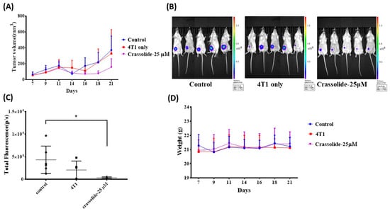 Crassolide-treated 4T1-luc2 cells effectively immunized mice against primary tumors. Test mice were vaccinated with 4T1-luc2 cells that underwent freeze-thaw cycles or were treated with crassolide at 25 µM for 24 h. At 7 d post-vaccination, live 4T1-luc2 tumor cells were implanted. Tumor progression in test mice was visualized by bioluminescence imaging (BLI). (A) Tumor volume was monitored until 21 d post tumor implantation. (B) BLI and (C) Quantitative data of BLI was determined at 16 d post tumor implantation. * p < 0.05 (D) Body weight of all test mice.