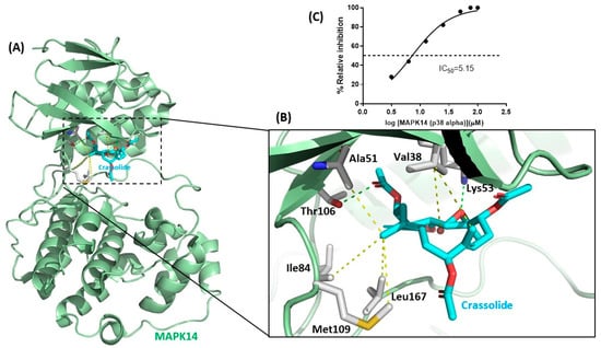 The blockade of mitogen-activated protein kinase 14 activation by crassolide. (A) Schematic representation of the molecular docking in the active site of MAPK14 (PDB 1DI9). The MAPK14 kinase is shown in light green cartoon. The key residues of kinase are shown in a stick representation. (B) The binding interactions between crassolide compound and MAPK14 are shown in hydrogen bonds (in green) and hydrophobic interactions (in yellow). (C) Dose–response curves of MAPK14 and its inhibitor crassolide in kinase inhibition assay.