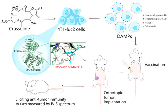 The mitogen-activated protein kinases (MAPKs) are a highly conserved family of serine/threonine kinases that play a central role in a range of fundamental cellular processes such as cell growth, proliferation, death, and differentiation [25,26,27]. There are at least three distinct MAPK signaling modules in mammals that mediate extracellular signals into the nucleus to turn on responsive genes: ERK, JNK, and p38 kinase [26]. The MAPK pathway is essential in regulating many cellular processes, including inflammation, cell stress response, cell differentiation, and gene expression [27]. In the context of immunogenic cell death (ICD), the p38 MAPK pathway has been shown to be involved in the regulation of ER stress, which is a major causative agent of ICD [28]. In some cases, activation of p38 MAPK has been shown to promote ICD by inducing the release of danger signals and activating the immune system. The precise role of p38 MAPK in ICD is still not fully understood. There are four identified p38 MAP kinases: p38-α (MAPK14), p38-β (MAPK11), p38-γ (MAPK12/ERK6), and p38-δ (MAPK13/SAPK4) [27]. In this study, crassolide from marine soft coral was identified as a novel inhibitor of MAPK14. Crassolide not only significantly reduced the viability of human breast cancer cells and murine mammary carcinoma cells, but also increased ICD and decreased CD24 expression in the latter. Orthotopic tumor engraftment experiments showed that crassolide-treated tumors elicited anti-tumor immunity. These findings deepen our understanding of MAPK14’s role in ICD and highlight crassolide’s potential as a treatment for breast and other types of cancer by activating anti-cancer immune responses (Figure 9).