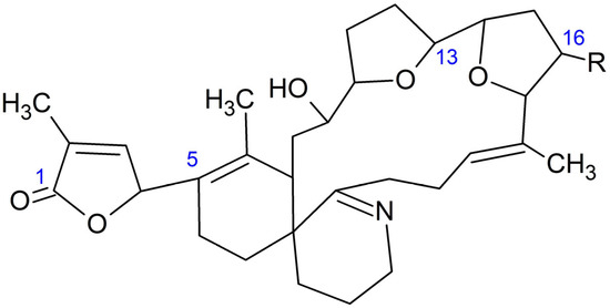 - Zurhelle, C.; Nieva, J.; Tillmann, U.; Harder, T.; Krock, B.; Tebben, J. Identification of novel gymnodimines and spirolides from the marine dinoflagellate Alexandrium ostenfeldii. Mar. Drugs 2018, 16, 446. [Google Scholar] [CrossRef]