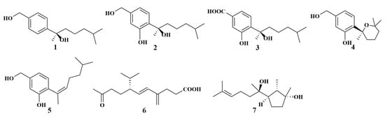 Aspergillus sp. ZJ-2008004, derived from the Xestospongia testudinaria (South China Sea), produced four novel bisabolane-type sesquiterpenoids, aspergiterpenoid A (1), (−)-sydonol (2), (−)-sydonic acid (3) and (−)-5-(hydroxymethyl)-2-(2′,6′,6′-trimethyltetrahydro-2H-pyran-2-yl)phenol (4), as well as a known fungal metabolite (5). All compounds showed selective antibacterial activities against eight bacterial strains with minimum inhibitory concentration (MIC) values between 1.25 and 20.0 µg/mL []. Fusarium sp. KJMT. FP. 4. 3, isolated from the same genus sponge (Indonesian) as Aspergillus sp. ZJ-2008004, yielded two known compounds, tricinonoic acid (6) and cyclonerodiol (7) (Figure 1), which showed weakly antibacterial activities against multidrug-resistant Salmonella enterica ser. Typhi, with MIC values of 125 µg/mL for each [].