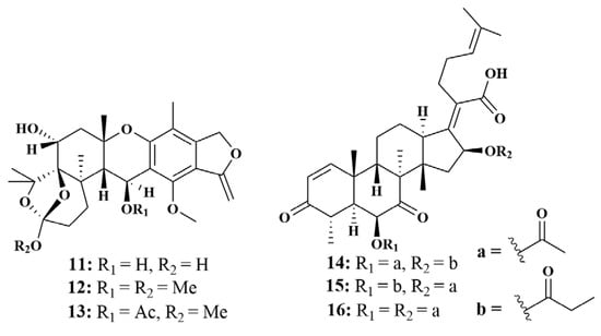 A new meroterpenoid, austalide R (11), together with two known compounds, austalide M (12) and austalide N (13), were obtained from Aspergillus sp. from the Mediterranean sponge Tethya aurantium. Compounds 11 and 12 possessed broad-spectrum antibacterial activities against Halomonas aquamarina, Polaribacter irgensii, Pseudoalteromonas elyakovii, Roseobacter litoralis, Shewanella putrefaciens, Vibrio harvey, V. natriegens, V. proteolyticus and Vibrio carchariae, with MIC values of 0.001-10 µg/mL, while compound 13 can inhibit H. aquamarine and V. natriegens, with MIC values of 0.01 µg/mL, respectively []. Meanwhile, two novel helvolic acid derivatives, 16-O-propionyl-16-O-deacetylhelvolic acid (14) and 6-O-propionyl-6-O-dea-cetylhelvolic acid (15), and one known helvolic acid (16) (Figure 3) cultivated from an unidentified sponge-associated fungus, A. fumigatus HNMF0047 (Wenchang, China), both displayed stronger antibacterial activity against Streptococcus agalactiae, with MIC values of 16, 2 and 8 μg/mL, respectively [].