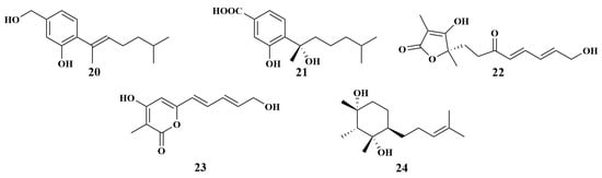 An examination of the fungal strain Aspergillus sydowii ZSDS1-F6 (Xisha Islands, China) revealed aspergillusene A (20) and sydonic acid (21). Among them, 20 showed modest antimicrobial activities against Klebsiella pneumonia and Aeromonas hydrophila, with MIC values of 21.4 and 4.3 μM, respectively, while compound 21 can inhibit Enterococcus faecalis, with an MIC value of 18.8 μM []. Saturnispol F (22) and saturnispol H (23), two novel conjugated olefinic metabolites, were first isolated from marine-sponge-associated fungus Trichoderma saturnisporum DI-IA collected from the Xisha Islands, which provided additional evidence to support the assumption that the same fungal species from a marine environment are capable of activating a distinct biosynthetic pathway. Moreover, compounds 22 and 23 exerted selective effects against a panel of bacteria strains, including vancomycin-resistant Enterococcus (VRE) and Bacillus subtilis, with MIC values ranging from 1.63 to 12.9 µg/mL []. Hypocrea koningii PF04, also separated from the Xisha Islands sponge sample, produced citrantifidiol (24) (Figure 5), which displayed mild antibacterial activity against Staphylococcus aureus, with an MIC value of 32 μg/mL [].