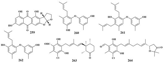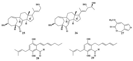Elena et al. reported the isolation and identification of two known compounds, dihydroauroglaucin (28) and isodihydroauroglaucin (29) (Figure 6), from Eurotium chevalieri MUT2316 associated with the Atlantic sponge Grantia compressa. Compound 28 showed inhibitory activities against Staphylococcus aureus, Enterococcus faecalis and Streptococcus pneumoniae, with MIC values of 124, 64 and 8 μg/mL, respectively, while compound 29 exhibited inhibitory activities against S. aureus and E. faecalis, with MIC values of 4–64 μg/mL [].