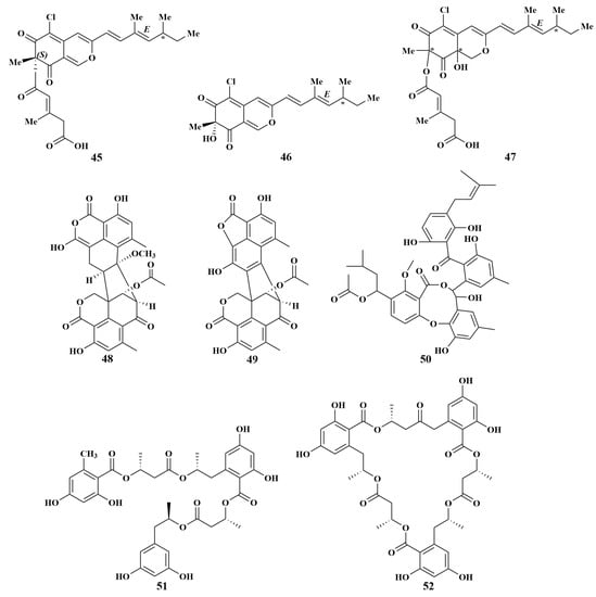 Hansfordia sinuosae, recovered from the Niphates sp. sponge (South China Sea), was the source of a new polyester, hansforester A (51), and a known analogue, ascotrichalactone A (52) (Figure 9). Both 51 and 52 exhibited potent inhibition against a panel of bacterial strains, including the agricultural pathogenic bacteria, Pseudomonas lachrymans, Agrobacterium tumefaciens, Xanthomonas vesicatoria and Ralstonia solanacearum, with MIC values of 15.6 μM for each, and the human-infected bacterium Staphylococcus aureus, with MIC values of 3.9 μM for each [].
