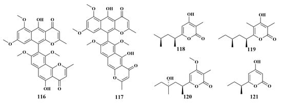 Fonsecinone A (116) and isoaurasperone A (117), discovered from Reniera japonica-associated fungus Aspergillus niger L14, was the first report possessing potent anti-Helicobacter pylori activity for dimeric naphtho-γ-pyrones, with MIC values of 2–4 µg/mL []. Aspergillus niger LS24, isolated from the same genus sponge as Aspergillus niger L14, gave three novel 4-hydroxy-α-pyrones, nipyrones A-C (118–120), together with one known compound, germicidin C (121) (Figure 14). Compound 120 exhibited significant inhibitory activities against Staphylococcus aureus and Bacillus subtilis, with MIC values of 8 and 16 µg/mL. Compounds 118, 119 and 121 exhibited moderate antimicrobial effects against S. aureus, Escherichia coli and B. subtilis, with MIC values in the range of 32–64 µg/mL. Significantly, 118–121 showed weak activity against MRSA, with MIC values of 128 µg/mL for each [].