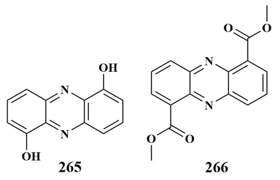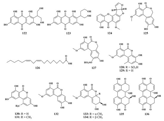 In the continuing search for biologically active secondary metabolites in Callyspongia sp. sponge-associated fungi (Xuwen Country, China), two new dibenzopyrones with a rare sulfate group, alterlactone 5′-O-sulfate (127) and 3′-hydroxyalternariol-5-O-methyl ether-3′-O-sulfate (128), as well as eight known compounds 5-O-methyl ether (129), alternariol (130), alternariol-5-O-methyl ether (131), altenusiol (132), isoaltenuene (133), altenuene (134), dihydroalterperylenol (135) and alterperylenol (136) (Figure 15) were discovered. All compounds showed mild inhibitory activities and a broad spectrum against eight foodborne bacteria, with MIC values ranging from 15.63 to 125 μg/mL [].