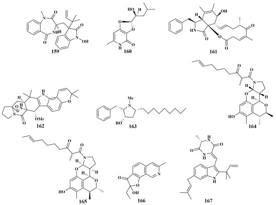 Besides compounds 11, 12, 13 and 92, Aspergillus sp. was also the source of 3-((1-hydroxy-3-(2-methylbut-3-en-2-yl)-2-oxoindolin-3-yl)methyl)-1-methyl-3,4-dihydrobenzo[e][1,4]diazepine-2,5-dione (159), dihydroisoflavipucine (160) and cytochalasin Z17 (161), and had the same antibacterial activities []. Wang et al. reported the isolation and identification of one known compound, notoamide F (162), from Aspergillus sclerotiorum GDST-2013-0501 (South China Sea) in 2022, which showed moderate antibacterial activity against Staphylococcus epidermidis, with an MIC value of 12.5 µM []. Preussin (163), purified from Aspergillus candidus KUFA0062 associated with the sponge Epipolasis sp., exhibited broad antibacterial activities against Staphylococcus aureus, Enterococcus faecalis, VRE E. faecalis and MRSA, with equal MIC values of 32 µg/mL. Remarkably, it was the first report of the isolation of hydroxypyrrolidine alkaloids from A. candidus, and the presence of N-methyl on the cloalkane ring of this compound was important for its antibacterial activities. It also had the property of broadly inhibiting pathogenic bacteria and interfering with the biofilm formation of pathogenic strains, and thus could be used for the development of new antibiotics and anticancer drugs []. Perinadines B (164) and C (165) exhibited moderate in vitro antibacterial activity against Bacillus subtilis, with MIC values of 32 and 64 μg/mL, respectively. In addition, compared with secondary metabolites of Aspergillus sp., this class of tetracyclic skeleton alkaloids was rarely found in Aspergillus sp. LS116 [].