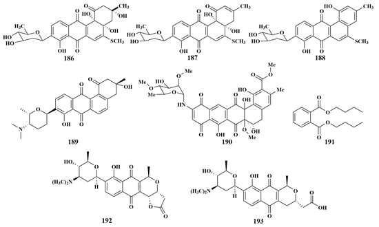 Streptomyces sp. M7-15 was separated from the marine sponge Scopalina ruetzleri (Mona Island), from which frigocyclinone (189) was discovered, which exhibited weak antibiotic activity against Bacillus subtilis []. In addition, frigocyclinone (189) showed an inhibition zone of 1 mM at a concentration of 1 mg/mL against Mycobacterium smegmatis []. A naphthacene glycoside, SF2446A2 (190), was extracted from the culture broth of Streptomyces sp. RV15 associated with Mediterranean sponge Dysidea tupha, and showed inhibitory activity against Chlamydia trachomatis []. Dibutylphthalate (191) was purified from Streptomyces sp. LS298, associated with the Fleshy knotted sponge (South China Sea), which can inhibit B. subtilis, with an inhibition circle diameter of 8 mM []. Streptomyces albolongus CA-186053, also obtained from the same genus actinomycete as the above compounds, produced medermycin (192) and antibiotic G15-F (193) (Figure 22). These two compounds were able to inhibit MRSA, with MIC values of 2 and 4 µg/mL, respectively, and had weak inhibitory activity against Escherichia coli, with MIC values of 32–64 µg/mL. This article constituted the first report on the chemical composition of extracts from a marine-derived Streptomyces strain related to S. albolongus, and identified this strain as a new source of medermycins [].