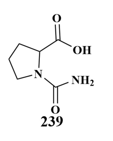 Guided by anti-Staphylococcus epidermidis, strain Penicillium sp. F37 associated with the sponge Axinella corrugate (South Brazilian Coast) was continued for a further chemical investigation and led to cis-cyclov(Leucyl-Tyrosyl) (168), which showed strong antibiotic activity, with an 85% inhibition rate. This is the first time that compound 168 has demonstrated antibacterial activity and it could be a promising antimicrobial lead compound []. Two new peptides, peniciadametizine A (169) and B (170), were discovered from Penicillium adametzioides AS-53, which was derived from an unidentified sponge (Hainan, China). Both 169 and 170 demonstrated antibacterial activities against Alternaria brassicae, with MIC values of 4.0 and 32.0 µg/mL, respectively [].