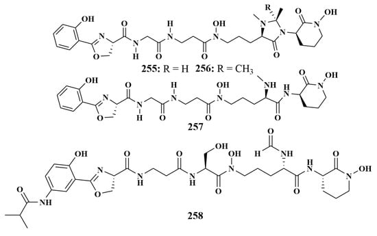 - Yan, J.X.; Chevrette, M.G.; Braun, D.R.; Harper, M.K.; Currie, C.R.; Bugni, T.S. Madurastatin D1 and D2, oxazoline containing siderophores isolated from an Actinomadura sp. Org. Lett. 2019, 21, 6275–6279. [Google Scholar] [CrossRef] [PubMed]