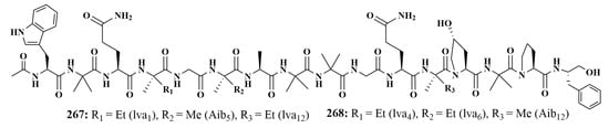 - Hao, X.M.; Li, S.S.; Ni, J.; Wang, G.Y.; Li, F.; Li, Q.; Chen, S.Z.; Shu, J.C.; Gan, M.L. Acremopeptaibols A-F, 16-residue peptaibols from the sponge-derived Acremonium sp. IMB18-086 cultivated with heat-killed Pseudomonas aeruginosa. J. Nat. Prod. 2021, 84, 2990–3000. [Google Scholar] [CrossRef]
