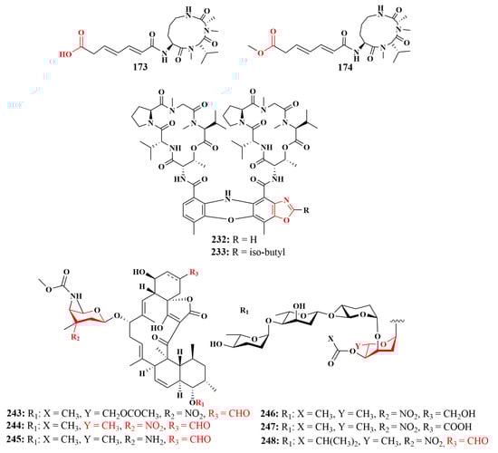 Two known analogues sclerotiotides L (171) and F (172), together with three new aspochracin-type cyclic tripeptides sclerotiotides M–O (173–175) (Figure 19), were produced by Aspergillus insulicola HDN151418, obtained from an unidentified sponge (Prydz Bay, Antarctica). Compounds 173 and 174 showed broad antimicrobial activities against a panel of pathogenic strains, including Bacillus cereus, Proteus species, Mycobacterium phlei, Bacillus subtilis, Vibrio parahemolyticus, Edwardsiella tarda, MRCNS and MRSA, with MIC values ranging from 1.56 to 25 µM, while compounds 171, 172 and 175 were less active [].