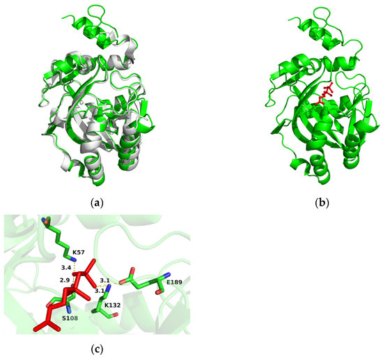 (a) Structure overlay of AlIDI model and its template hIPPI (gray; PDB ID 2i6k). (b) Molecular docking of AlIDI with substrate IPP (red). (c) Amino acid residues (K57, S108, K132, E189) hydrogen-bonded to IPP.