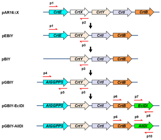 Plasmid constructions were subsequently conducted. Specifically, the frameshift mutated zeaxanthin β-glucosidase gene CrtX in the plasmid pACCAR16ΔcrtX was removed, generating a concise and compact plasmid. The resulting vector, bearing β-carotene biosynthesis gene cluster CrtE-CrtB-CrtI-CrtY from Pantoea ananatis, was designated as pEBIY. Then, the deficient plasmid pBIY was constructed by delating CrtE in the plasmid pEBIY. Subsequently, the amplified GGPPS candidate was introduced into the deficient plasmid pBIY to construct pGBIY vector harboring GGPPS-CrtB-CrtI-CrtY gene cluster. In other words, the excavated GGPPS in situ replaced the original CrtE by homologous recombination for functional identification. Next, the endogenous E. coli IDI gene (EcIDI) and Aurantiochytrium IDI gene (AlIDI) were allocated downstream of the GGPPS-CrtB-CrtI-CrtY cluster, constructing plasmid pEBIY-EcIDI and pEBIY-AlIDI, respectively (Figure 4). Moreover, the four recombinant plasmids were transformed into E. coli BL21 to generate corresponding stains, referred to as EBIY, BIY, GBIY, GBIY-EcIDI, GBIY-AlIDI in Table 1.