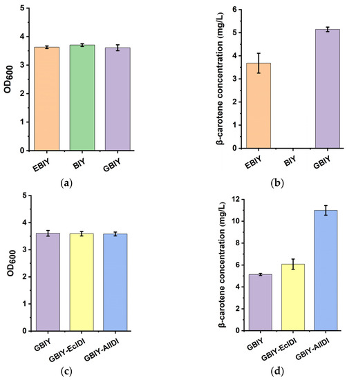 Physiological index measurement of stains. OD600 (a) and β-carotene yield (b) of stain EBIY, BIY and GBIY. OD600 (c) and β-carotene yield (d) of stain GBIY, GBIY-EcIDI and GBIY-AlIDI.