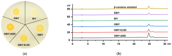 In this study, AlIDI also displayed a superior catalytic property compared to the endogenous IDI gene of Escherichia coli with higher β-carotene production. In conclusion, the expression of AlGGPPS and/or AlIDI, two key precursor synthase encoding genes in Aurantiochytrium, both improved the production of β-carotene (Figure 5b,d). The results were consistent with previous studies [8,29,30,31]. Furthermore, the highest β-carotene yield was observed in the stain coordinately expressing AlGGPPS and AlIDI, indicating the additive effects of AlGGPPS and AlIDI on β-carotene overproduction. Notably, the highest β-carotene production of the GBIY-AlIDI strain did not result in growth inhibition, indicating the excellent potential for further production improvement.